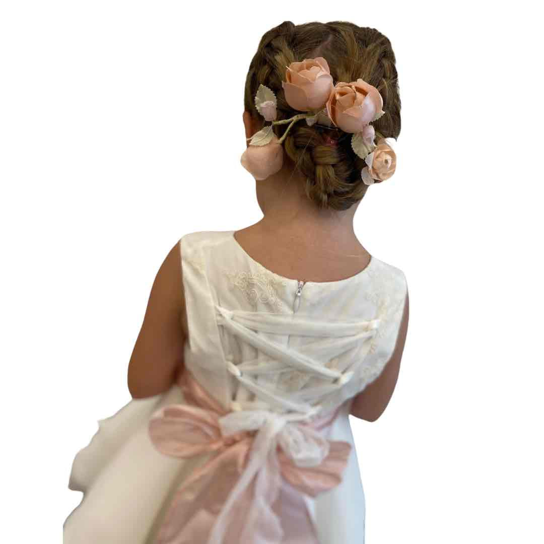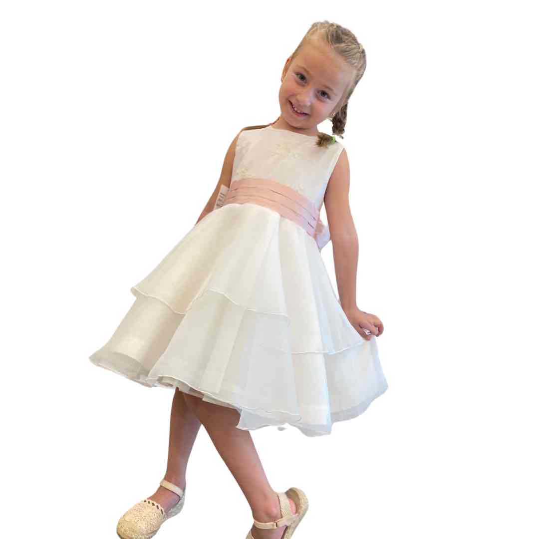 Abito in tulle a Balze con Nastro in seta sul tutto il girovita, doppio fiocco sul di dietro con Abbottonatura a corpetto art. 4890