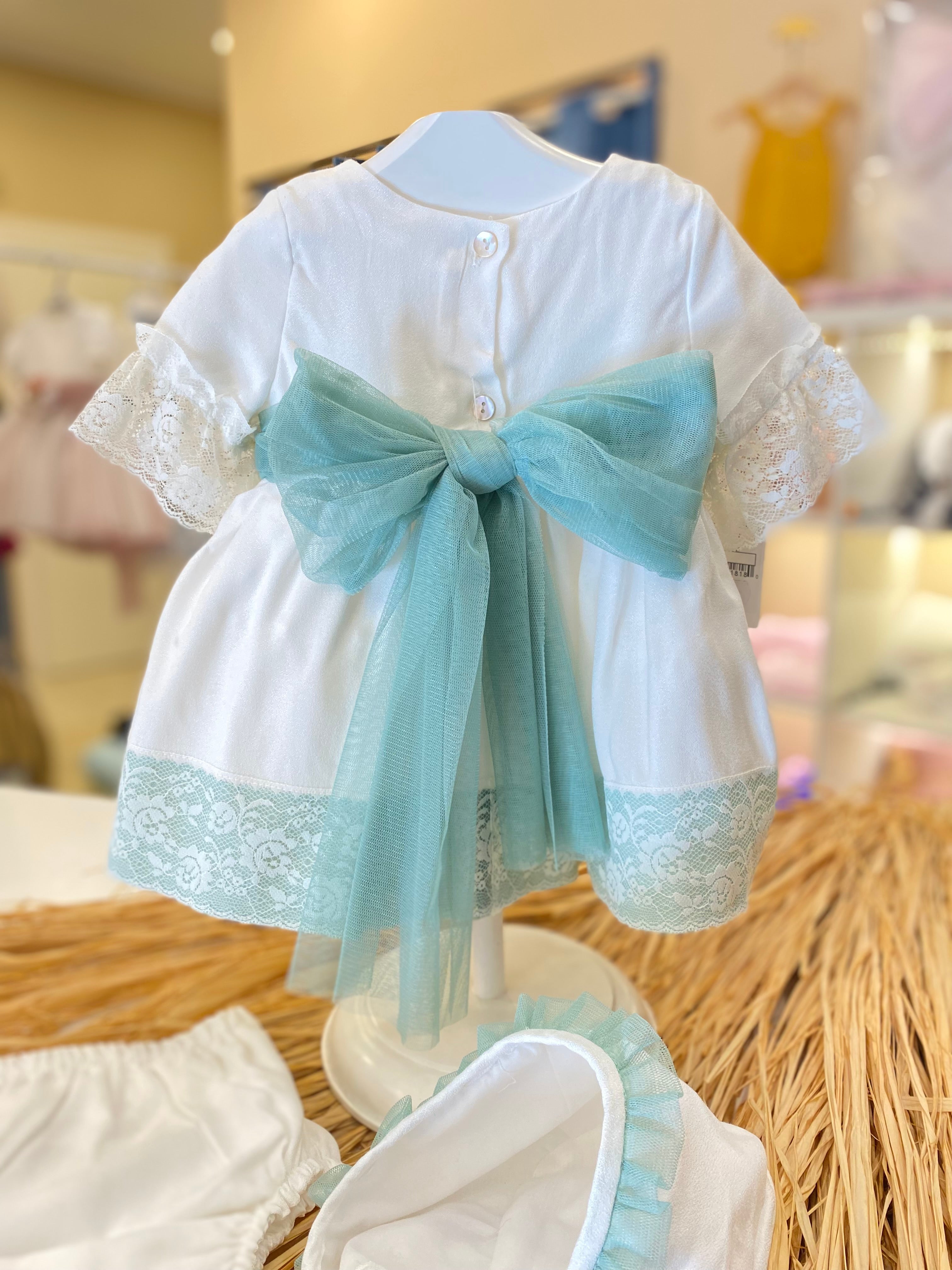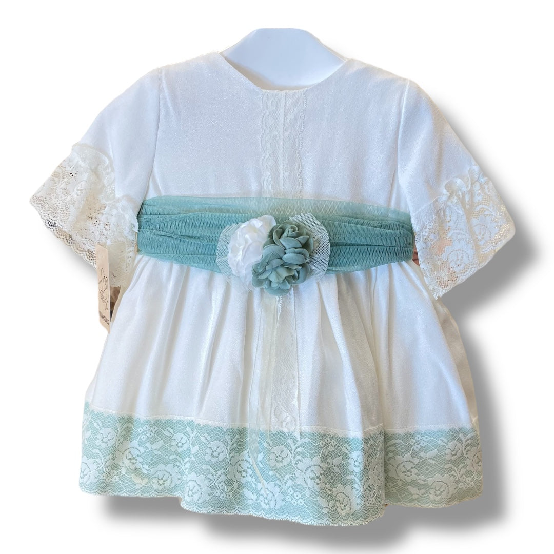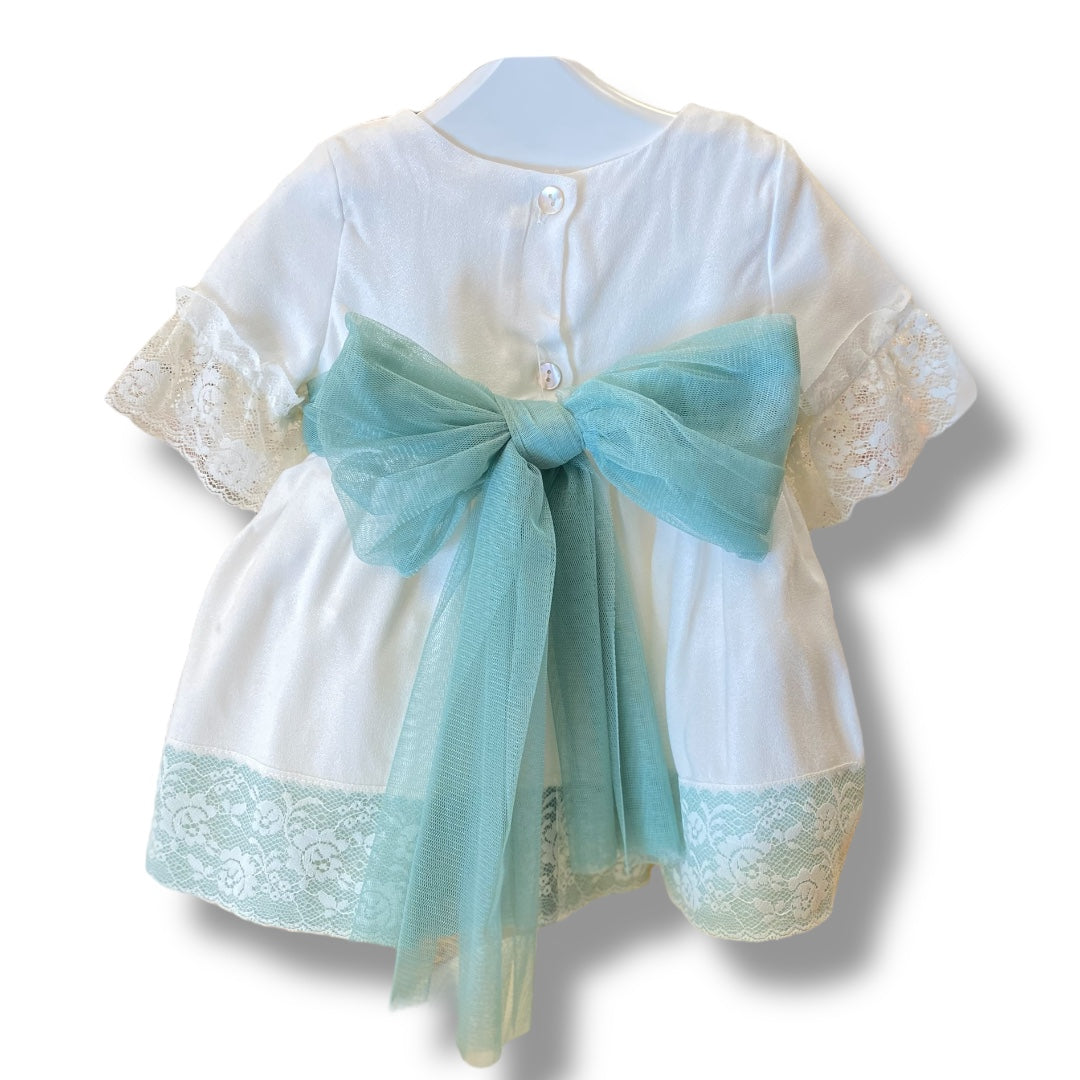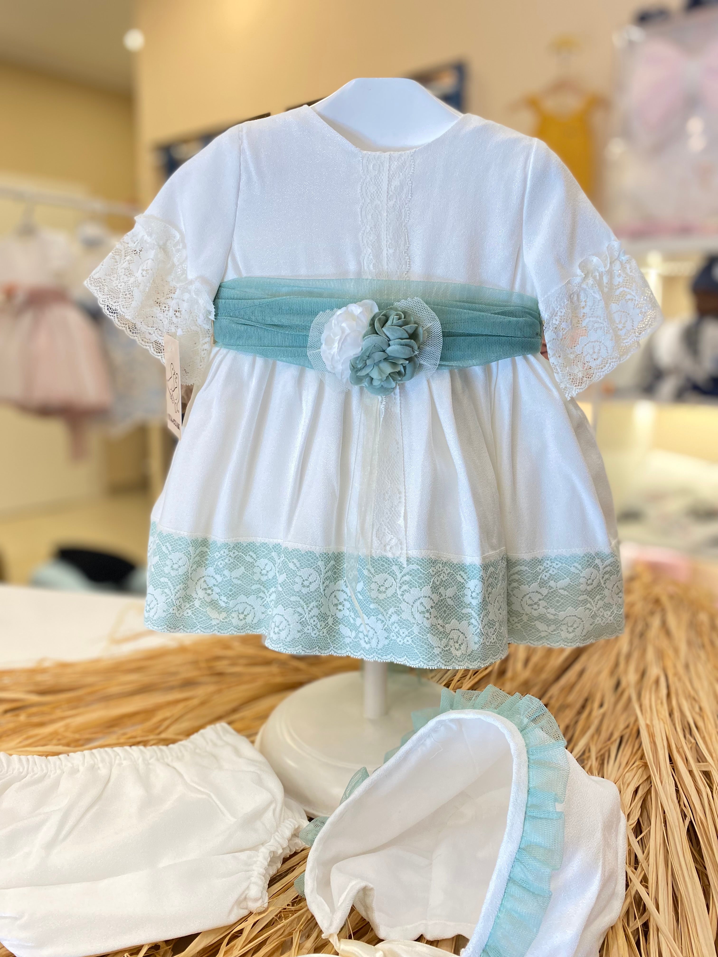 Abito principesco mezza manica in tulle e organza, fantasie e ricami floreali. l'abito è coordinato da coulotte e cuffietta per capelli, fiocco in tulle sul dietro. L'applicazione floreale posta sulla fascia in vita è removibile, vestibilità standard