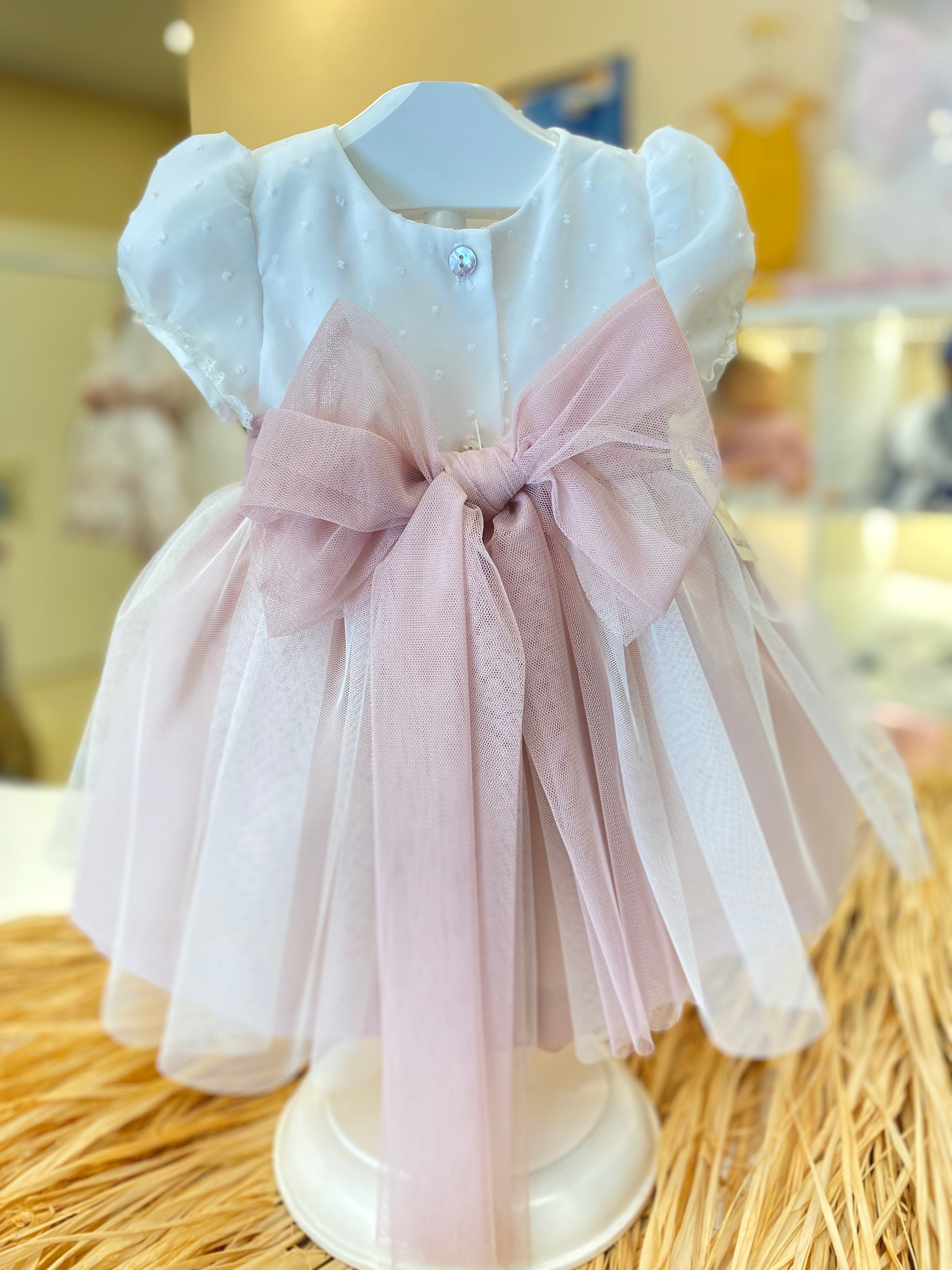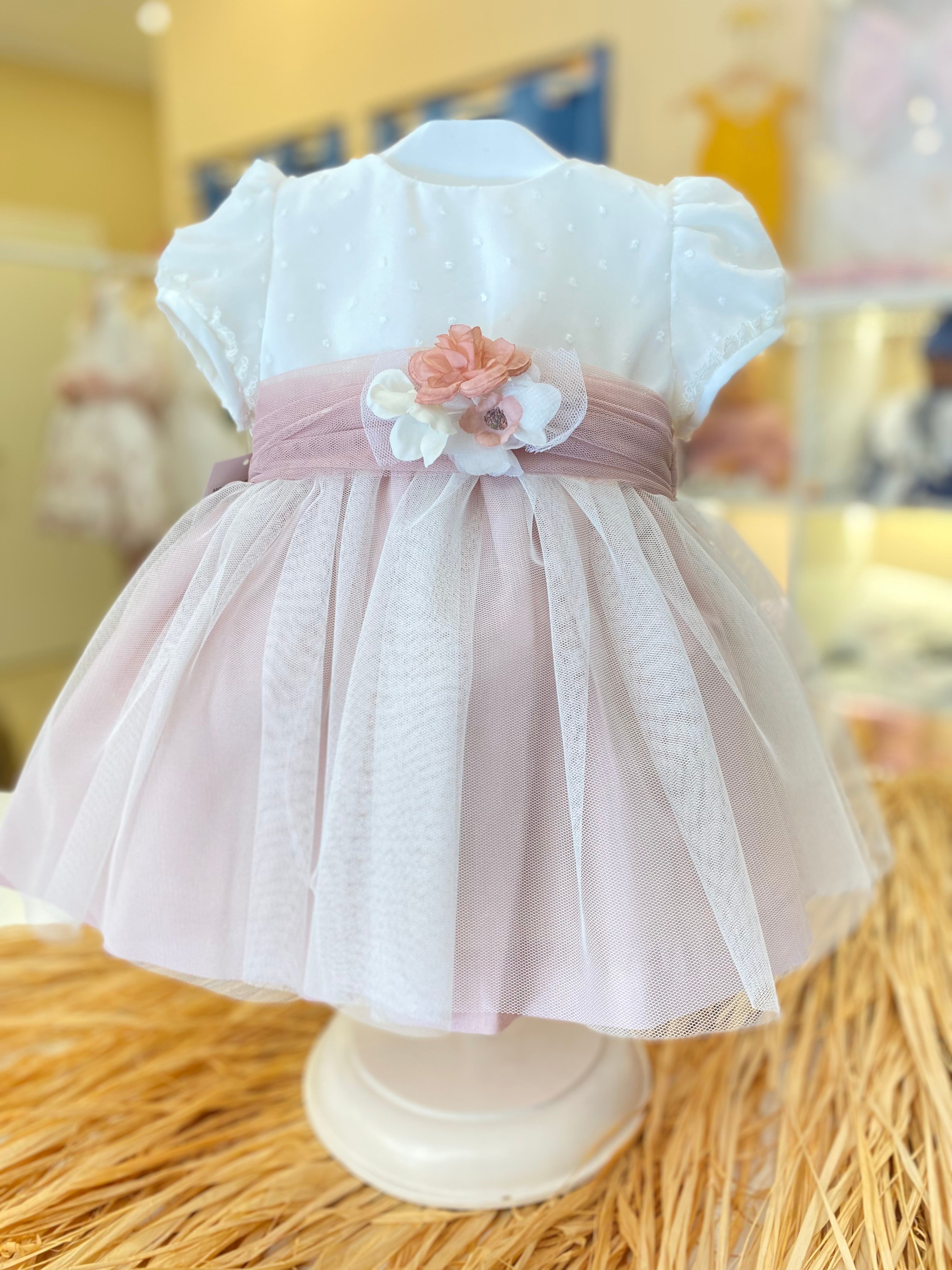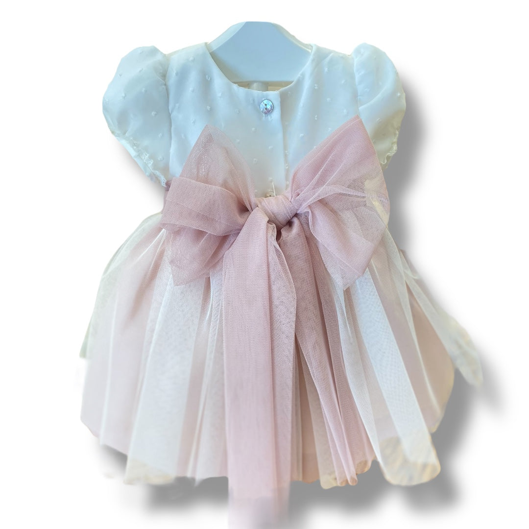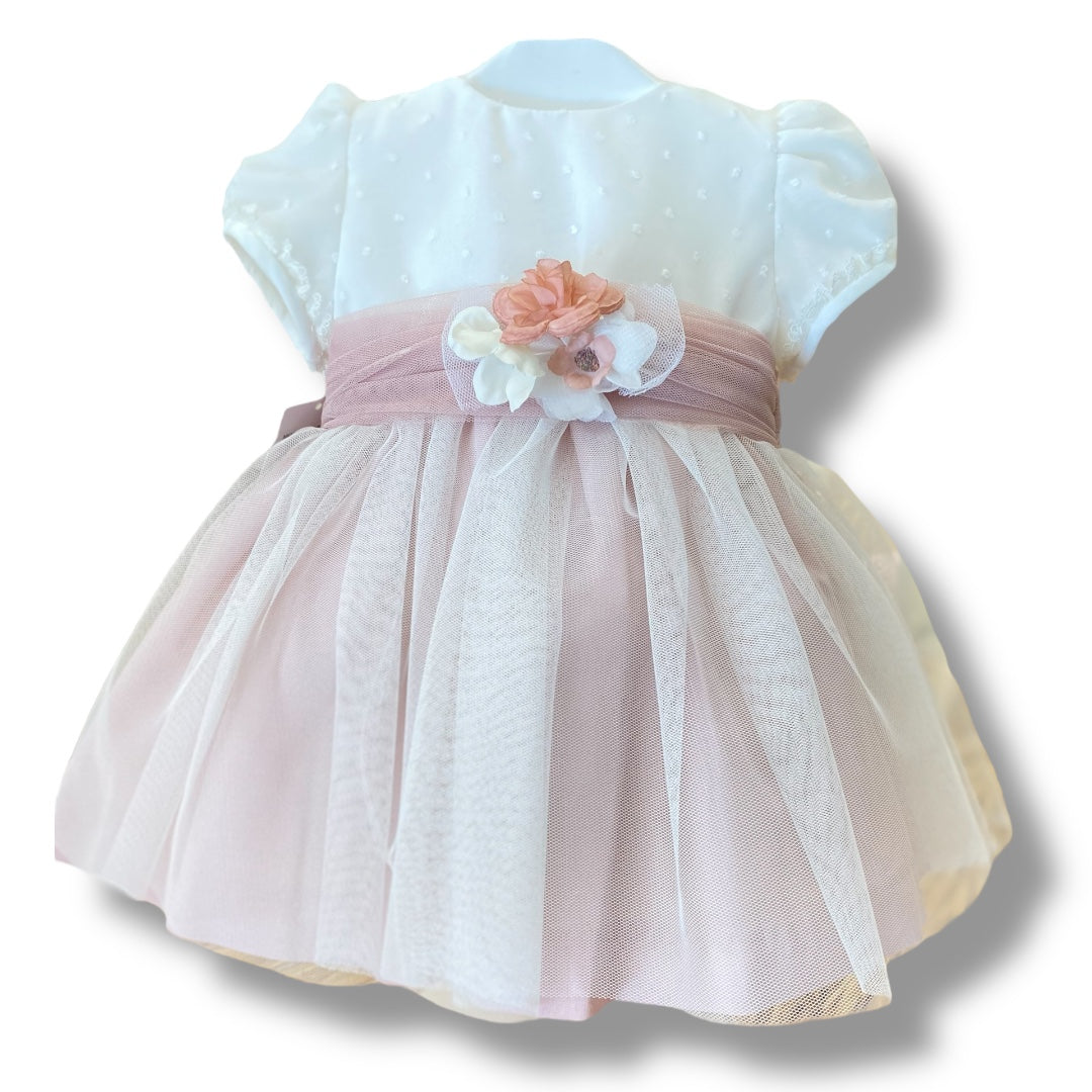 Abito principesco mezza manica in tulle. L'abito è coordinato da coulotte e cuffietta , fiocco in tulle sul dietro. L'applicazione floreale posta sulla fascia in vita è removibile, vestibilità standard