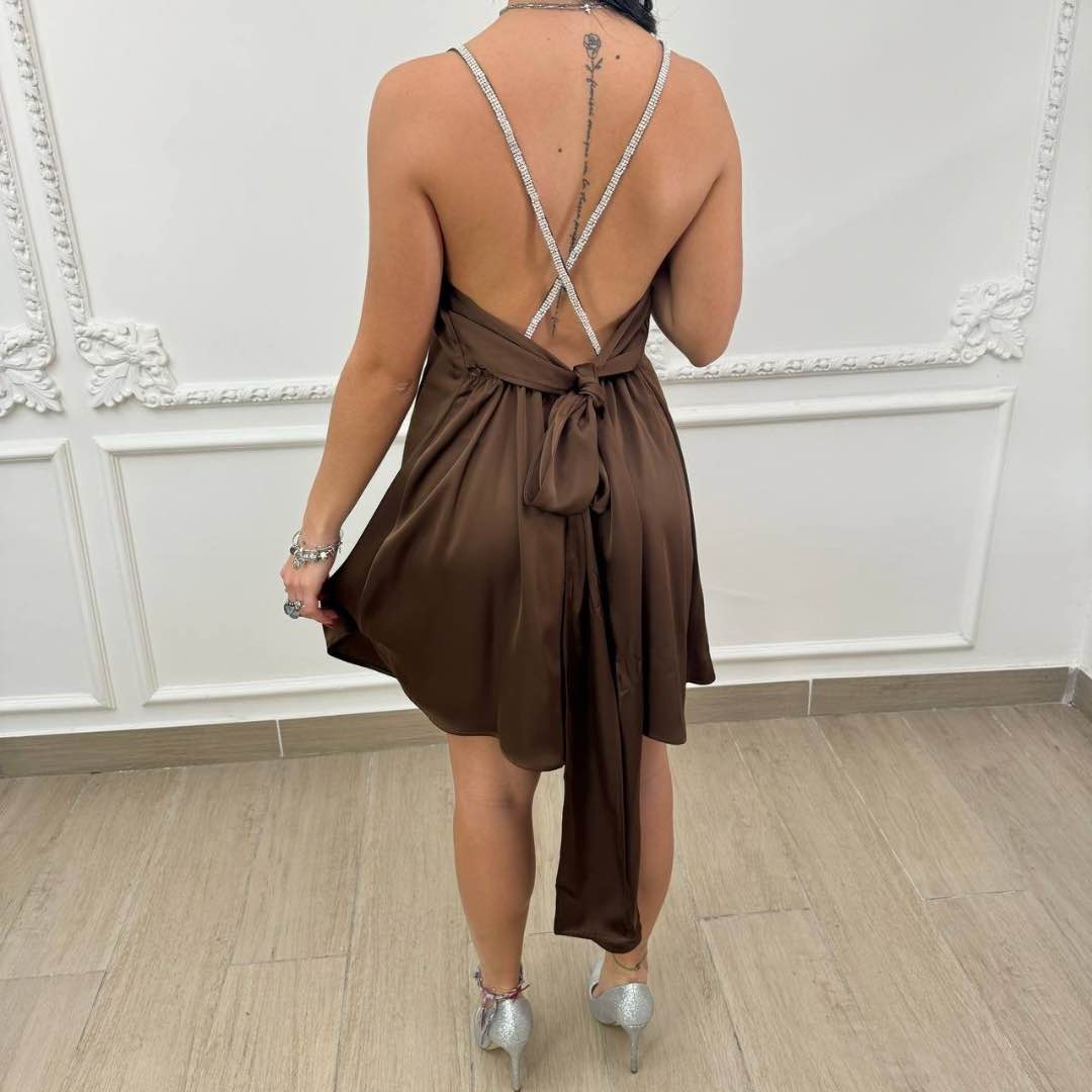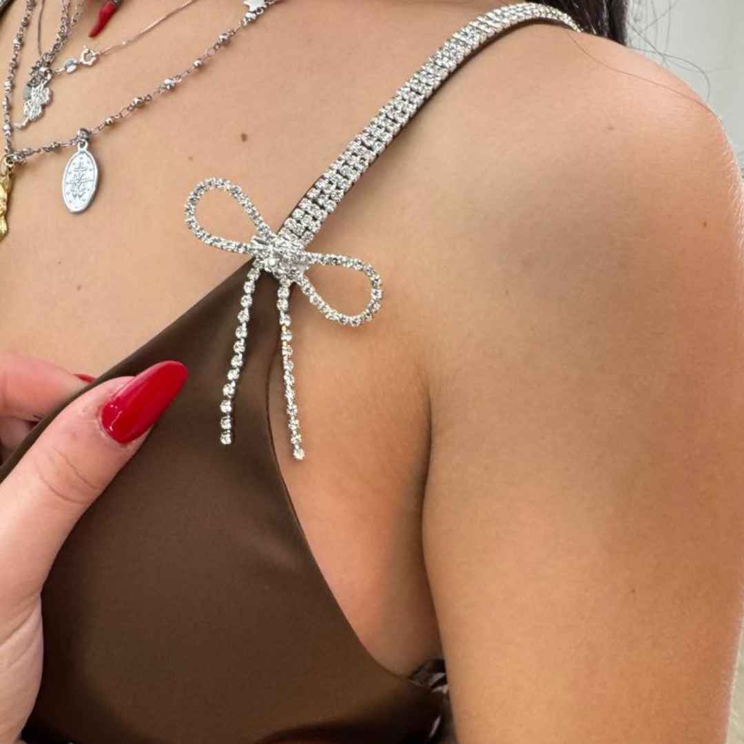 Abito effetto raso con fiocco sul retro presenta le bretelline interamente di strass con fiocchetto applicato sempre in strass. Vestibilità regolare e va a taglie.