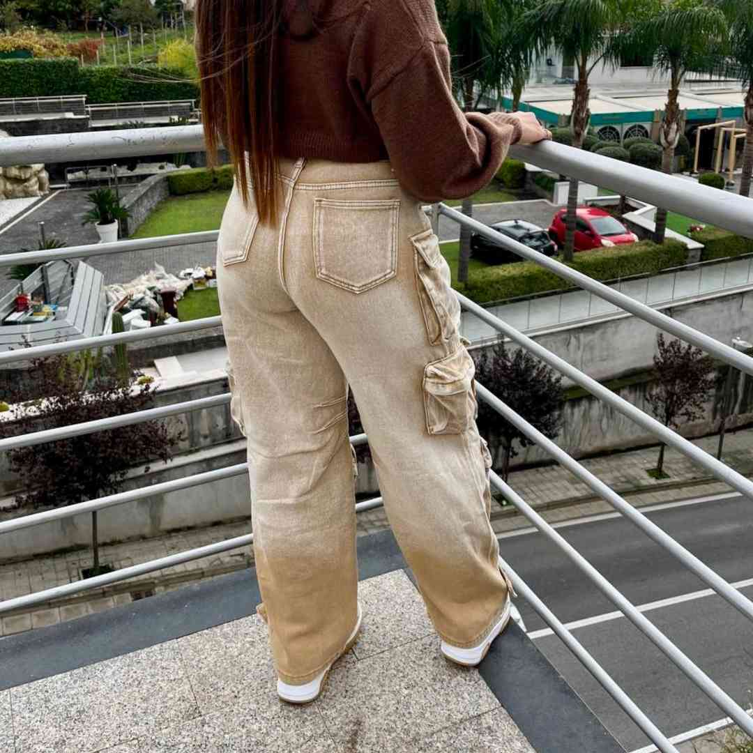 Jeans cargo di fondo beige sfumato in bianco con tasconi laterali.