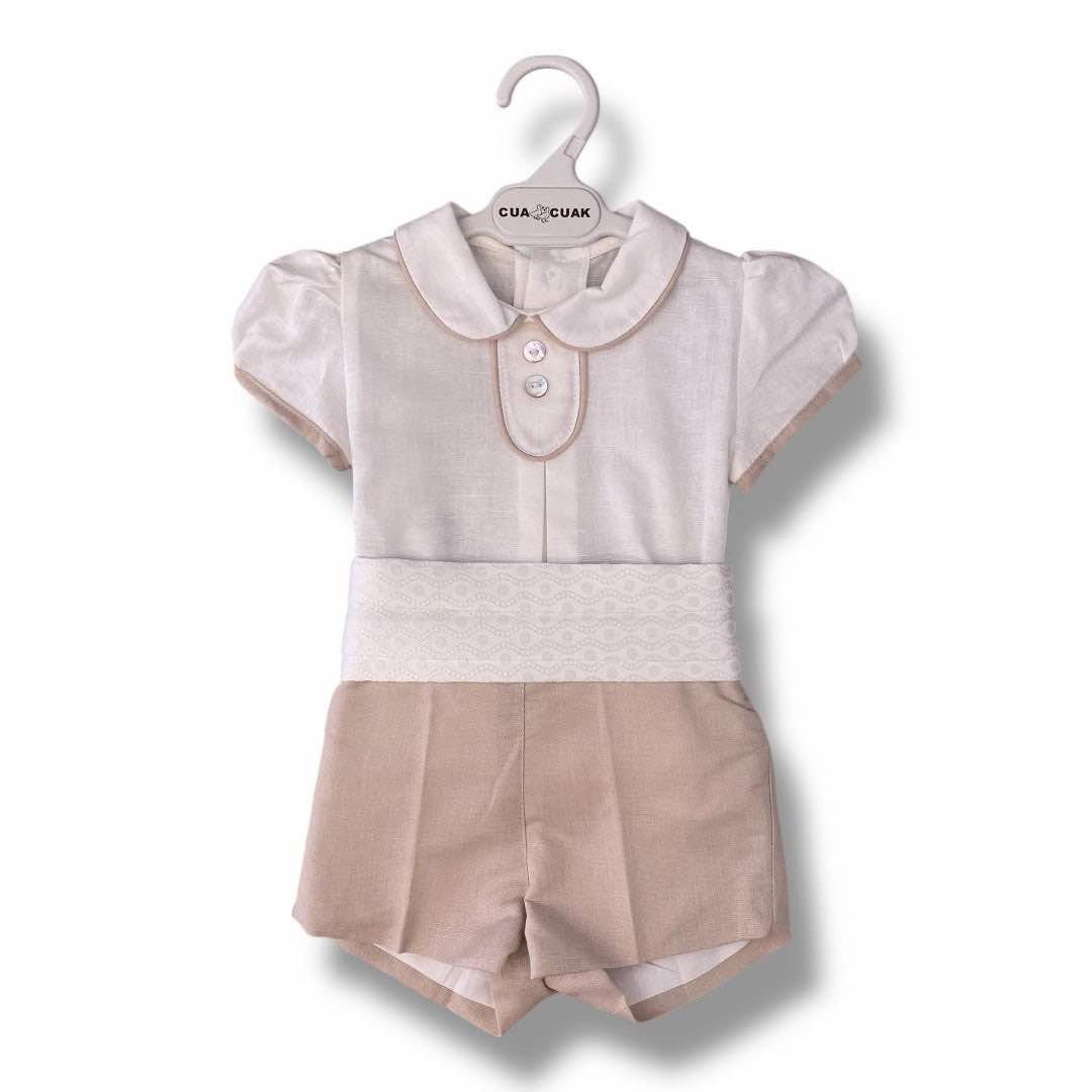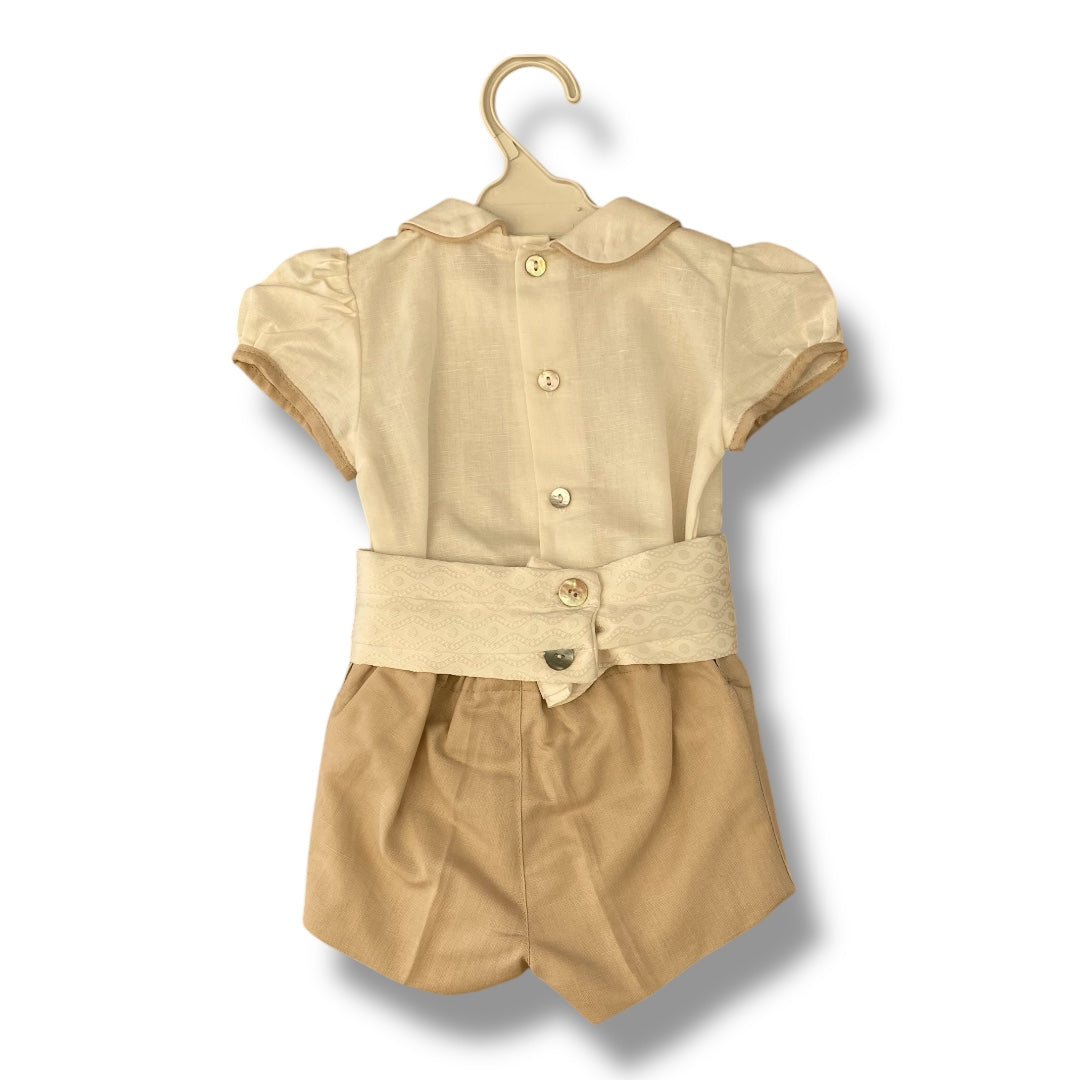 Completo in 100% Lino, Camicia con abbottonatura retrostante e pantaloncini regolabili in vita, arricchito da fascia in vita