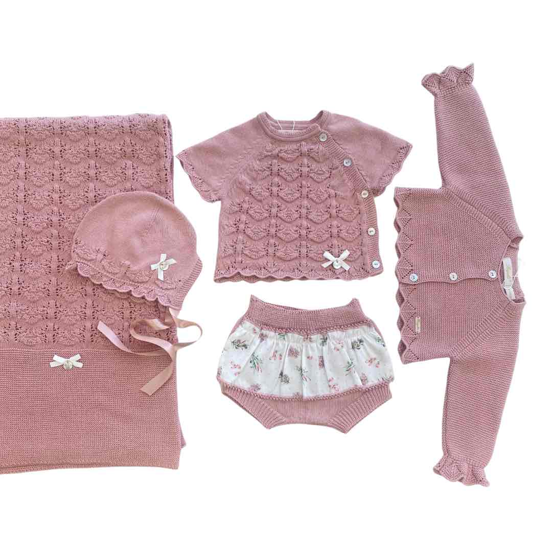 Coordinato in filo colorazione rosa antico composto da Copertina, completino, golfino,cuffietta
