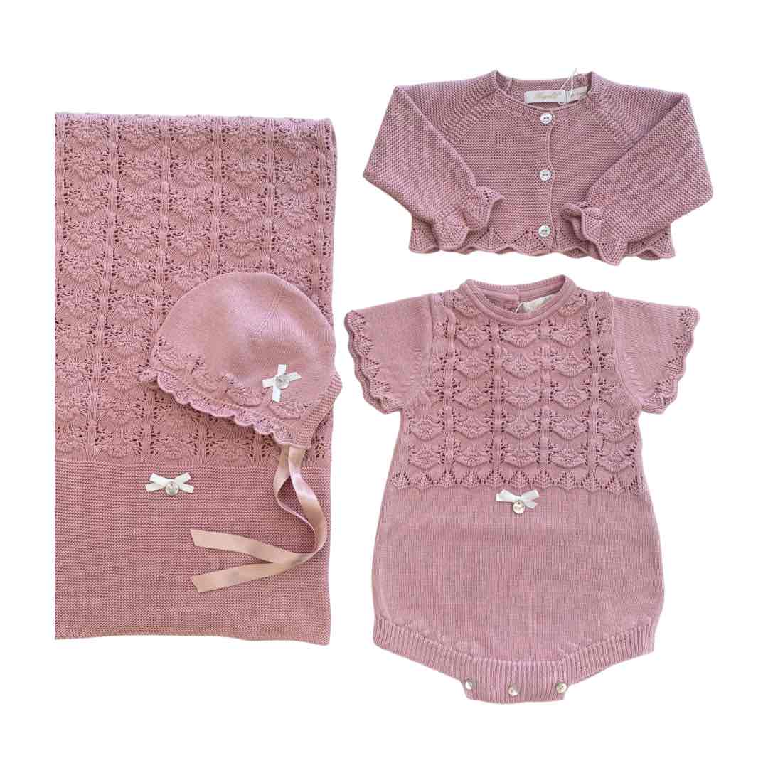 Coordinato in filo colorazione rosa antico composto da Copertina, completino, golfino,cuffietta