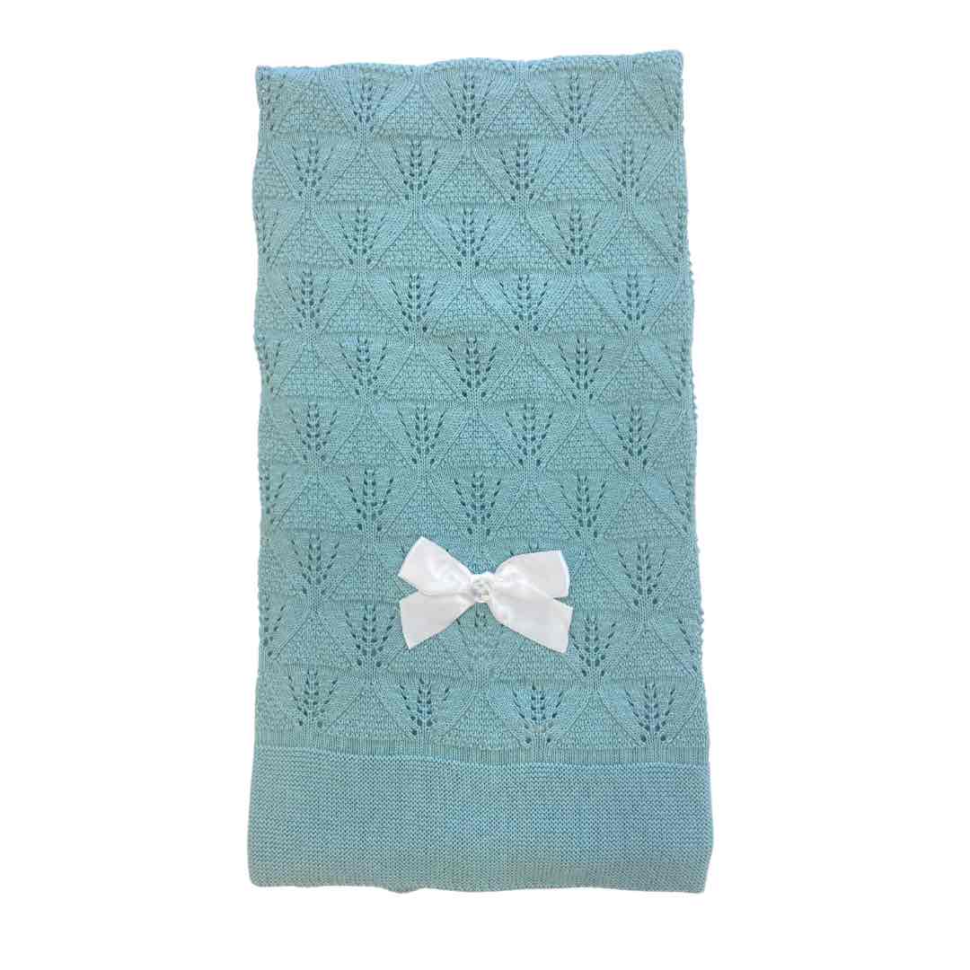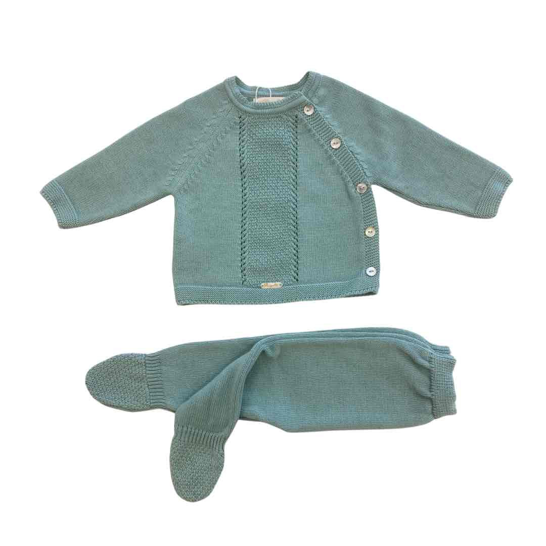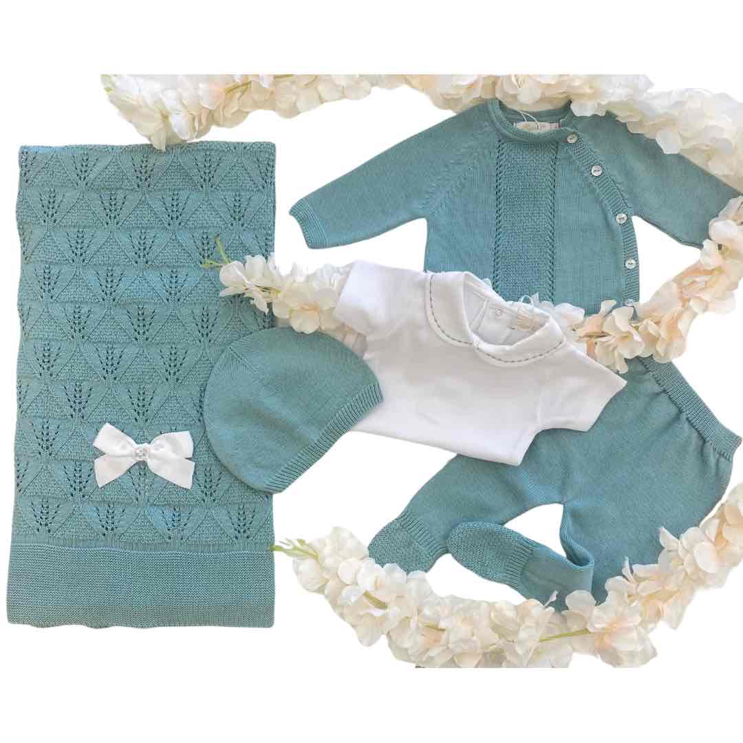 Coordinato in filo colorazione verde empolvado composto da Copertina, tutina due pezzi manica lunga , body ,cappellino