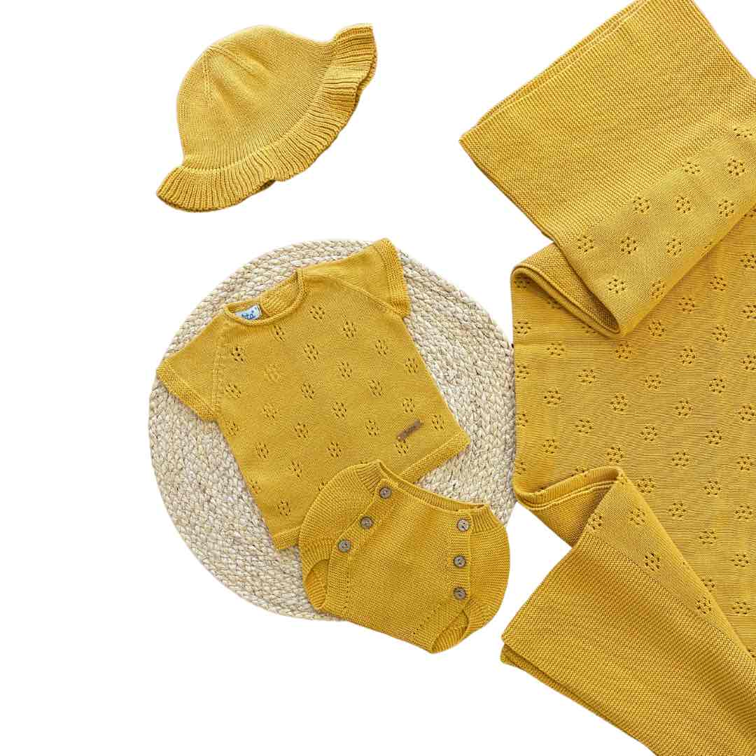 Coordinato con completino mezza manica e copri pannolino  , include la copertina in cotone organico, le scarpine, e cappellino
