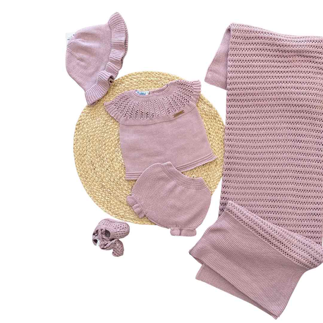 Coordinato con completino mezza manica e copri pannolino , include la copertina in cotone organico, le scarpine, e cappellino