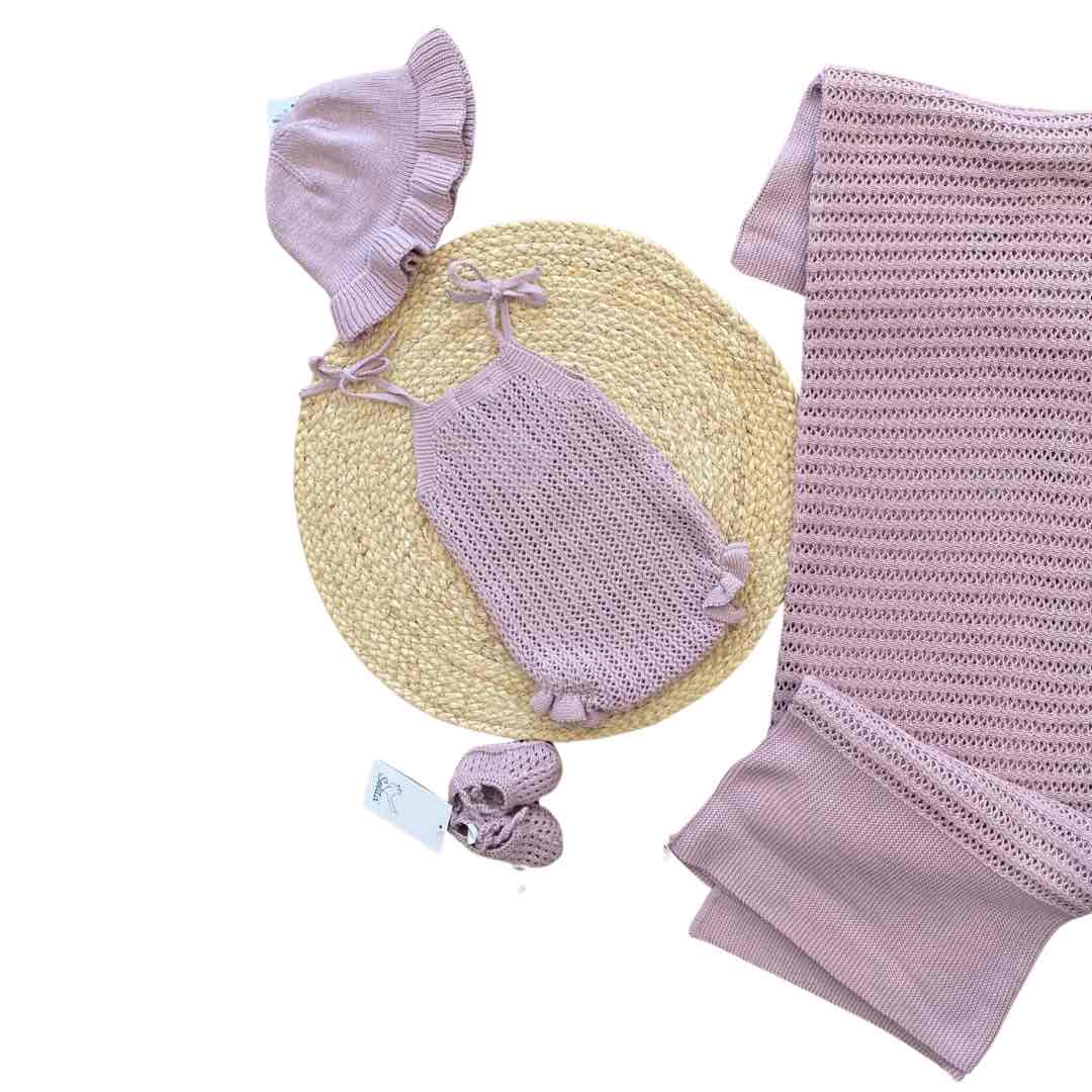Coordinato con pagliaccetto, include la copertina in cotone organico, le scarpine, e cappellino