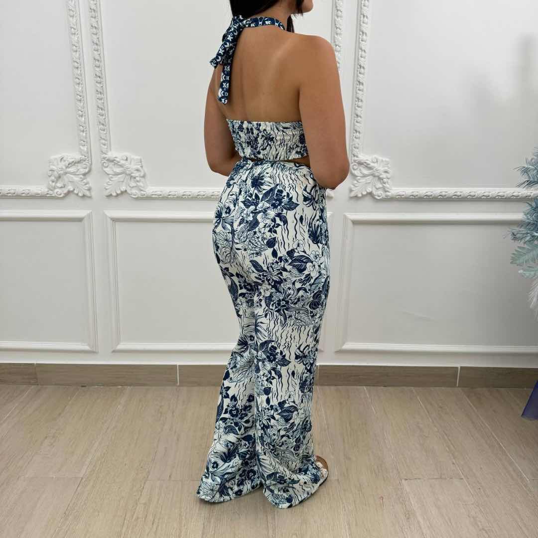 Coordset composto da pantagonna a palazzo e top incrociato al collo. Sia il top che il pantalone presentano l’elastico.
