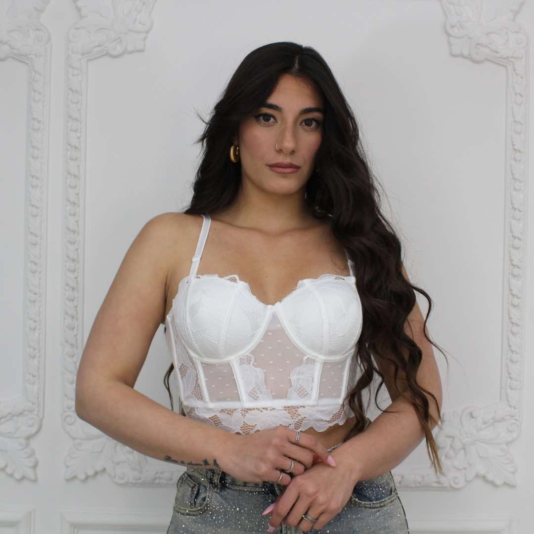 Corpetto in pizzo e trasparenze con spallina regolabile e coppe preformate all'interno. Va a taglie