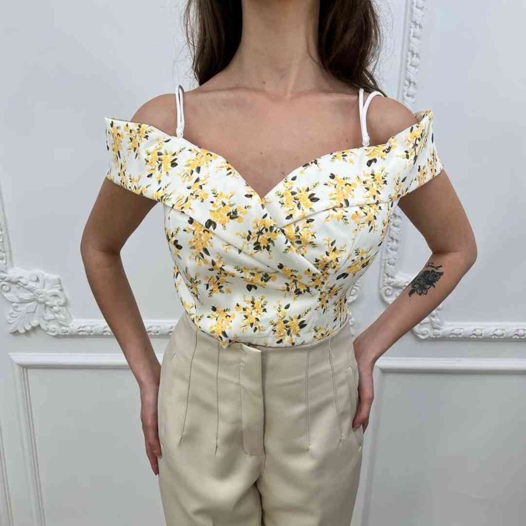 Top fantasia floreale con scollo a barca e spallina stretta regolabile, presenta abbottonatura con zip sul retro.