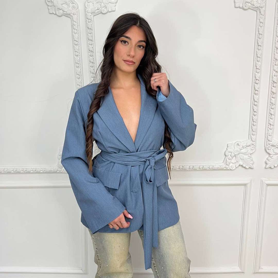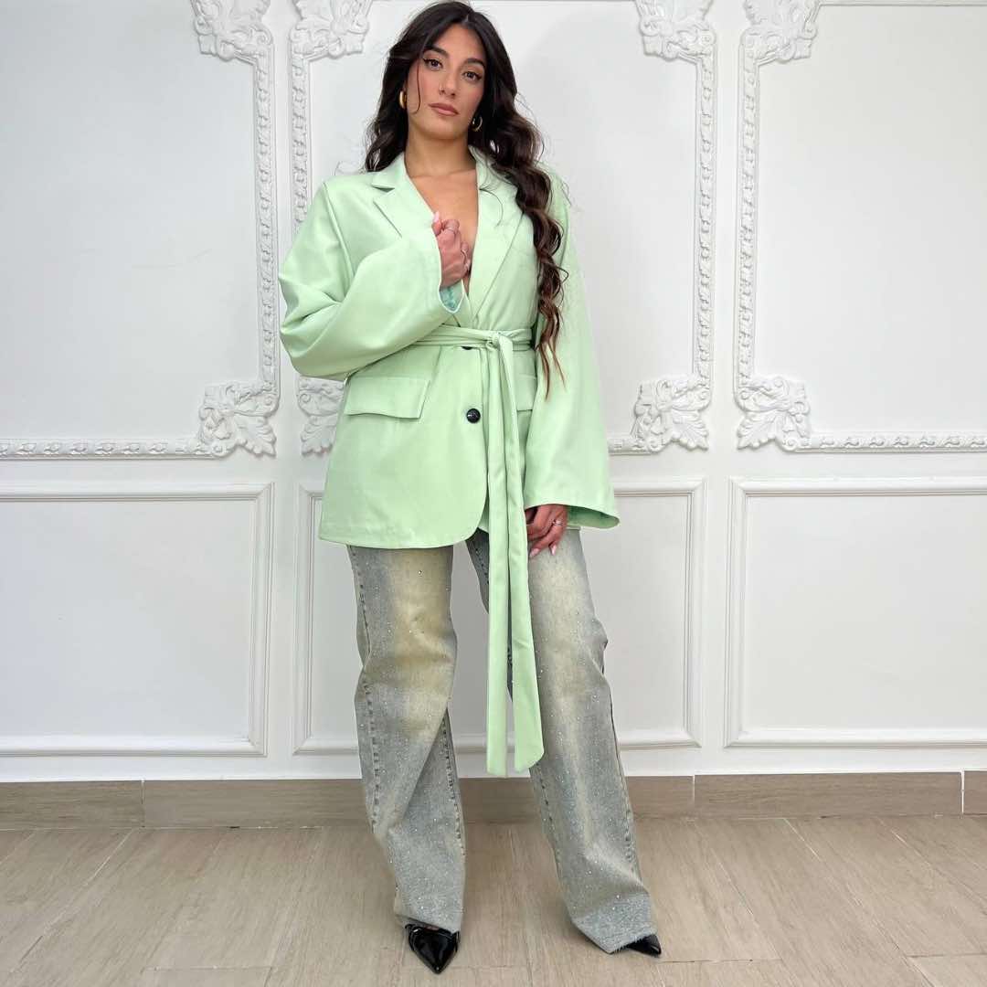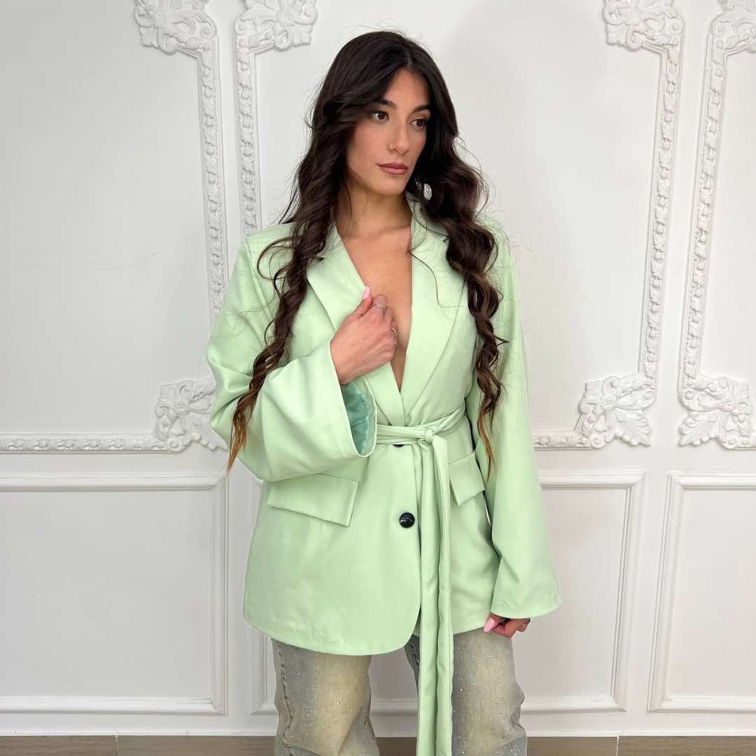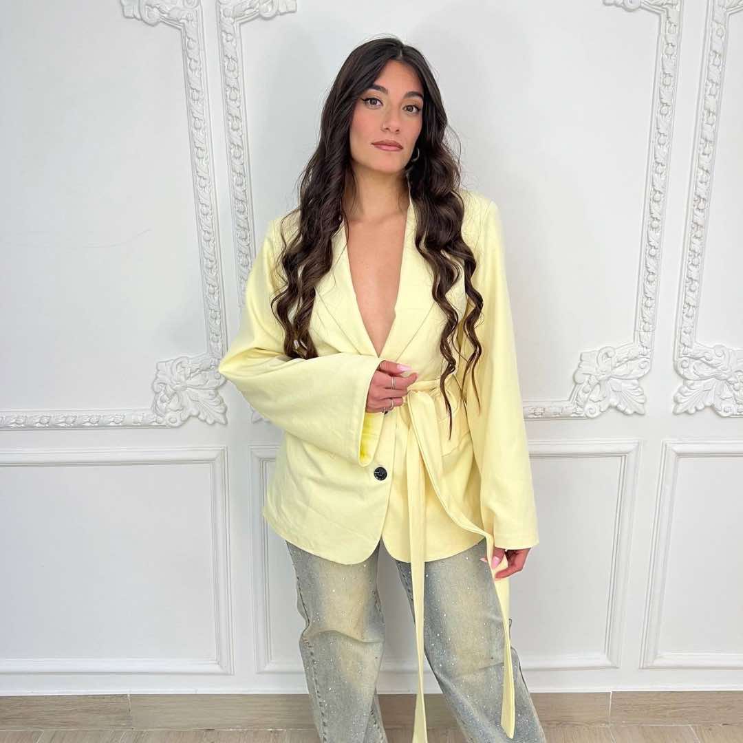 Giacca dalle spalline imbottite con bottoncini sul davanti e finti taschini,presenta il laccetto in vita come accessorio. Taglia unica,vestibilità consigliata da XS a XL