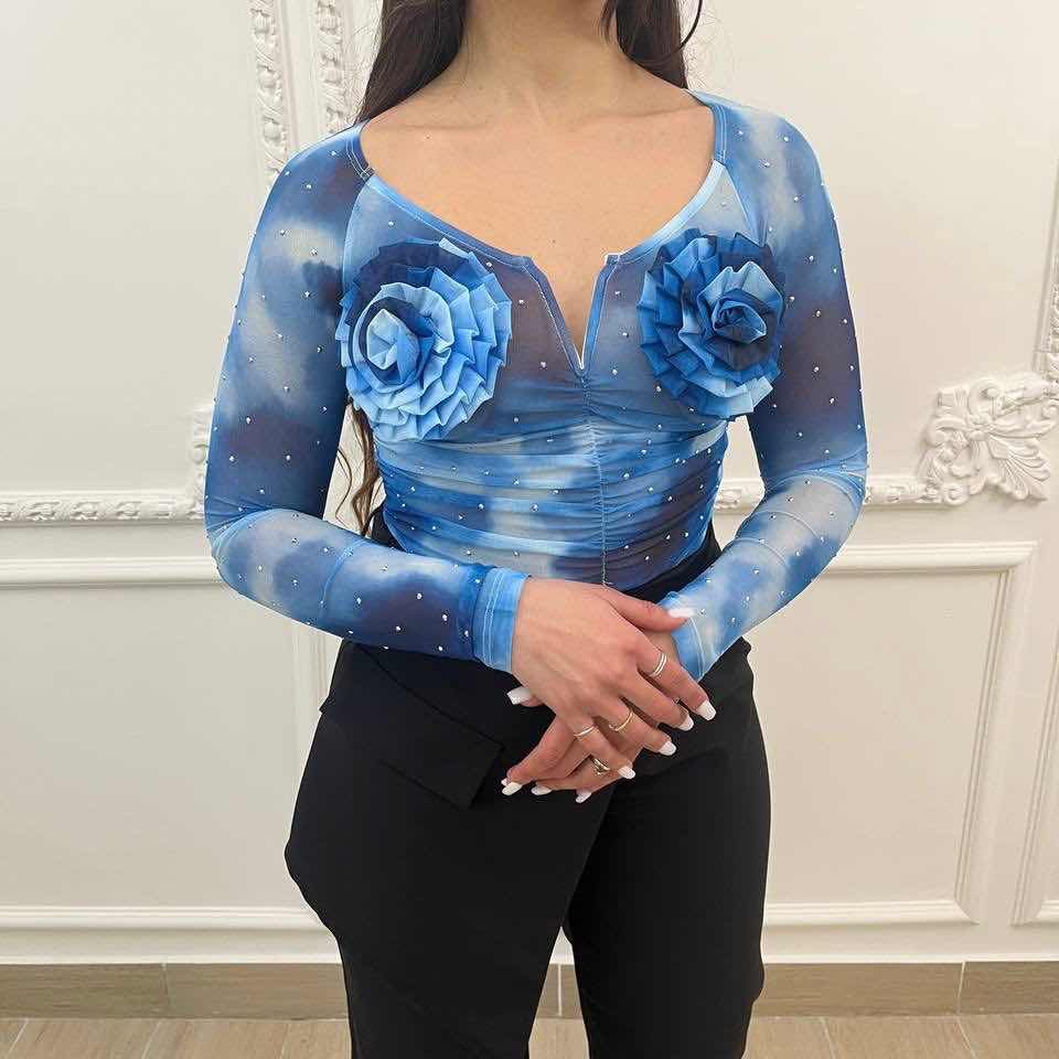 Maglia velata, fantasia sfumata, presenta sul davanti Swarovski e fiori applicati