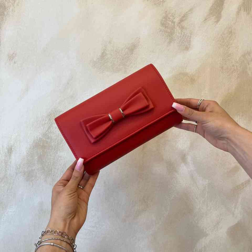 Pochette in ecopelle con fiocco sul davanti e catenina argento removibile.