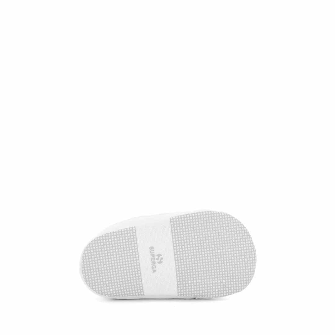 Scarpine culla colorazione bianco in macramè con lacci elastici e suola in cotone imbottito.