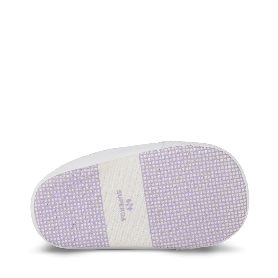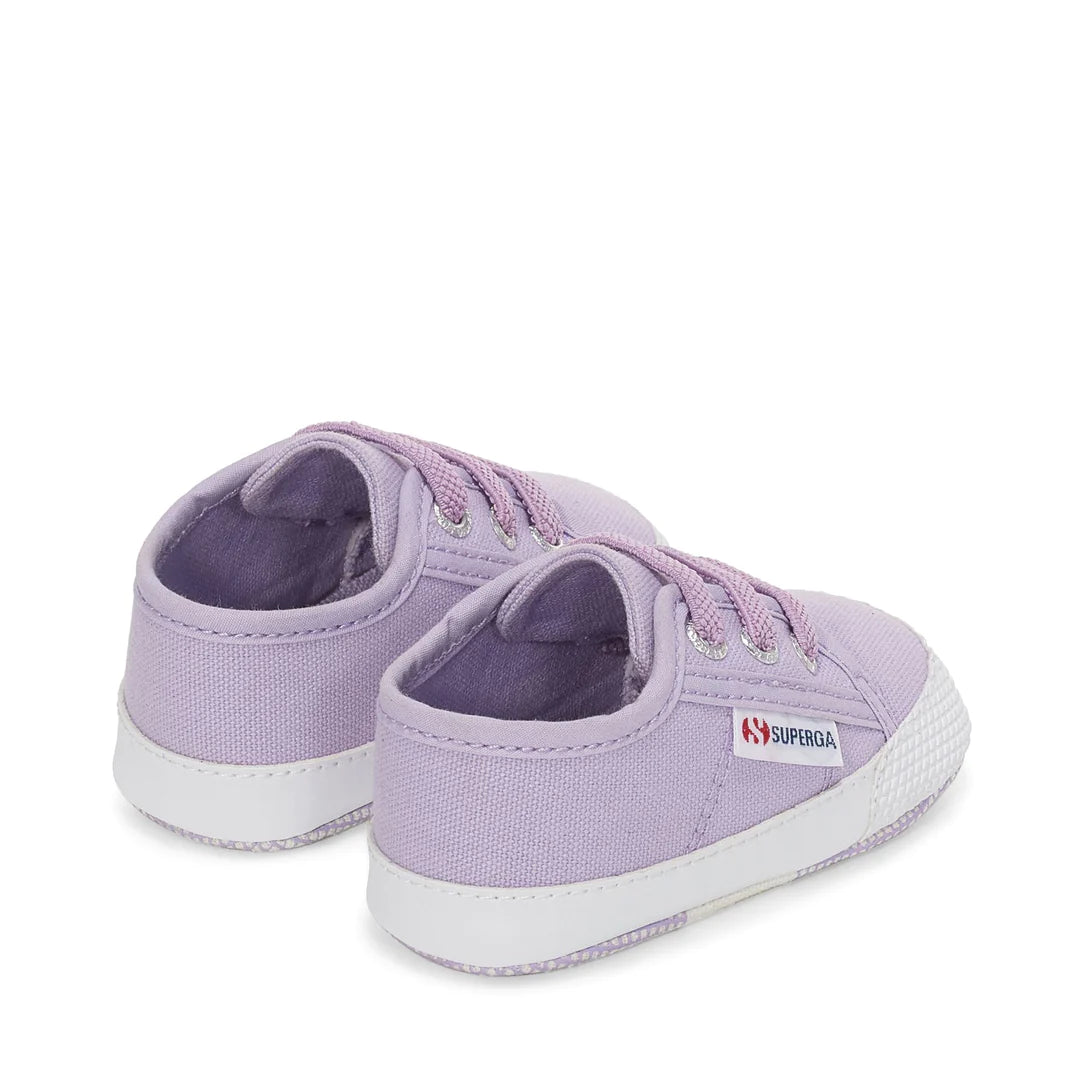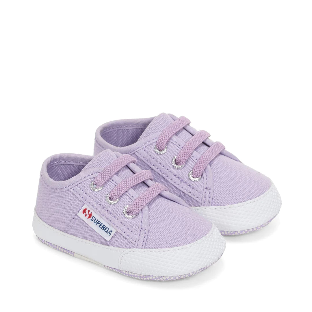 Scarpine culla colorazione lilla con lacci elastici e suola in cotone imbottito.