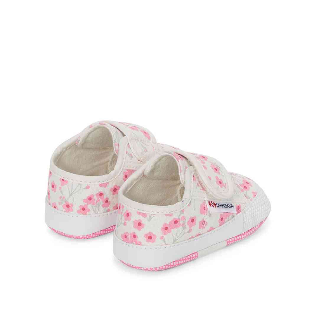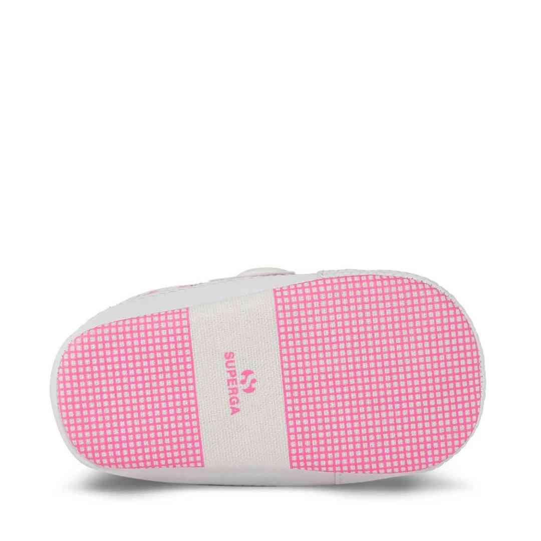 Scarpine culla colorazione bianco e rosa con stampa. Chiusura a strappo e suola morbida in cotone.