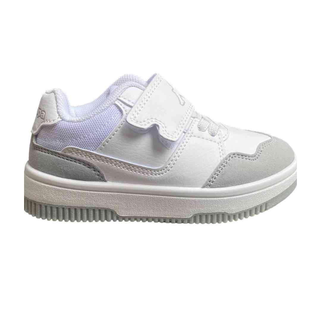 Sneakers KAPPA bianche e grigie con inserti in camoscio. Chiusura a strappo e lacci elastici