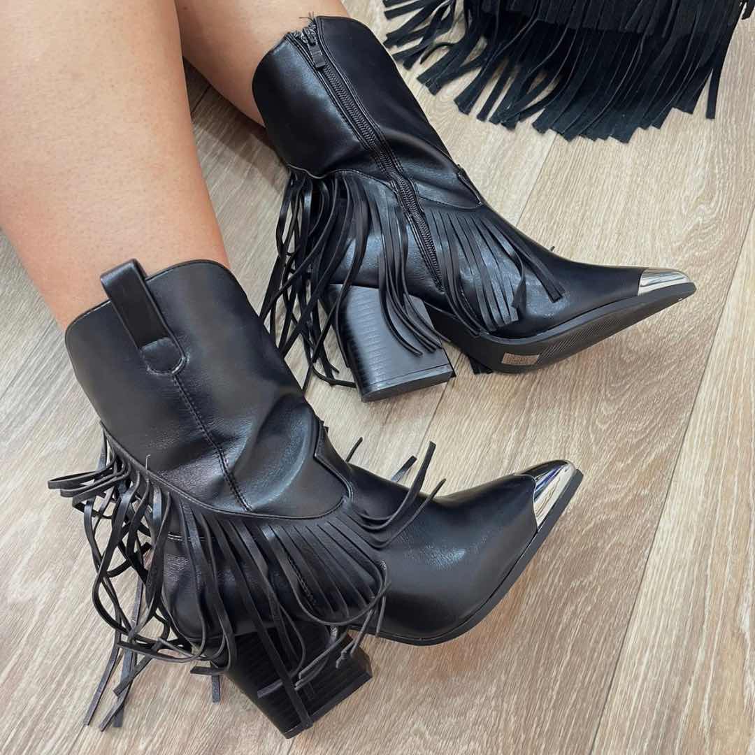 Stivaletto nero in ecopelle con particolari frange e punta argento.