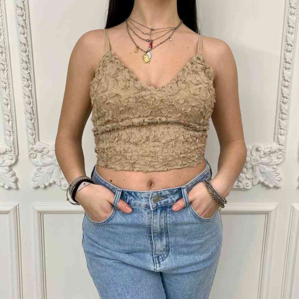 Top corto con bretelline regolabili, applicazioni floreali e trasparenze sul davanti.