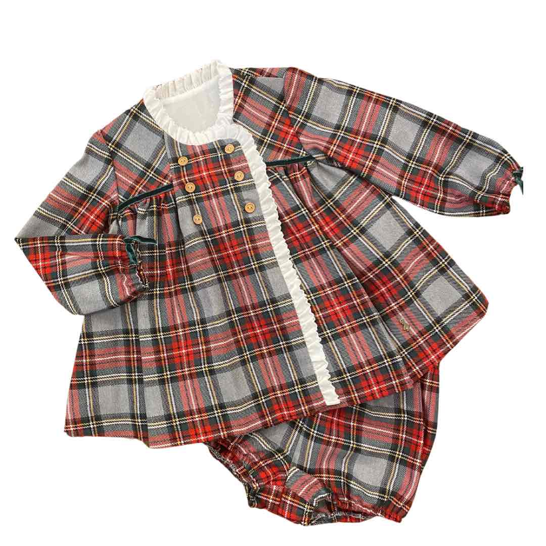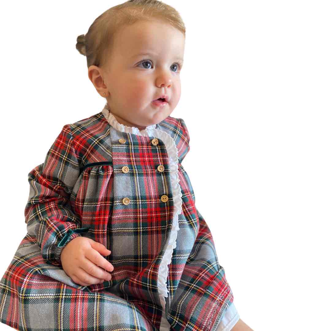 Abito fantasia scozzese con abbottonatura laterale, copri pannolino in coordinato
